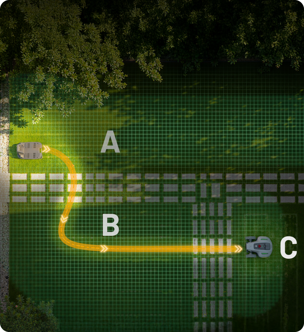 Simply guide it from the charging station through Zone A, Zone B, to Zone C. YUKA mini Vision will automatically explore, learn, and build detailed maps of up to three areas, and memorize the transition paths for full coverage.